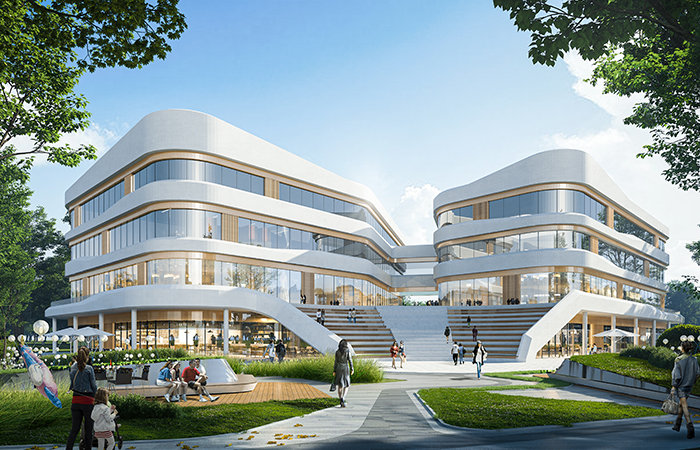 建筑色彩上以高明度、低彩度的暖色與米白為主色調(diào),局部輔以暖灰色。立面采用Low-e玻璃、鋁板等材料,充分表達建筑的現(xiàn)代感與未來感。