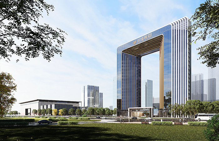 項目位于正定新區(qū)“四軸五心”的中央商務辦公區(qū)域內(nèi),隆興路商務軸北側(cè),由兩棟塔樓組成,功能為展廳、會議和辦公,總建筑面積5.8萬 m2,其中地上建筑面積4.2萬 m2。兩棟塔樓均為地下一層,地上21層,裙房2層,建筑高度100.85m,結(jié)構(gòu)高度86.700m。兩棟塔樓平面為八邊形,兩塔樓最近點距離約36.6m,最遠點距離約108.1m。建筑頂部設置八邊形造型和空中連廊與塔樓連為一體,“大道至簡,天下大同”,形成大底盤雙塔連體建筑。