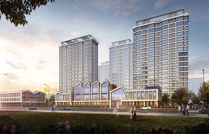 規(guī)劃結(jié)構(gòu)上,利用道路將整體用地劃分為東西兩個(gè)組團(tuán),西側(cè)地塊較為規(guī)整,在地塊中間部分設(shè)置景觀中軸,將幼兒園設(shè)置在采光良好的南側(cè)。建筑立面采用白色與駝色相結(jié)合,打造簡約現(xiàn)代的建筑立面造型,通過對(duì)立面分割加強(qiáng)建筑橫向視覺感,運(yùn)用精致簡約的線腳來體現(xiàn)建筑的典雅與華貴,彰顯建筑品質(zhì)。