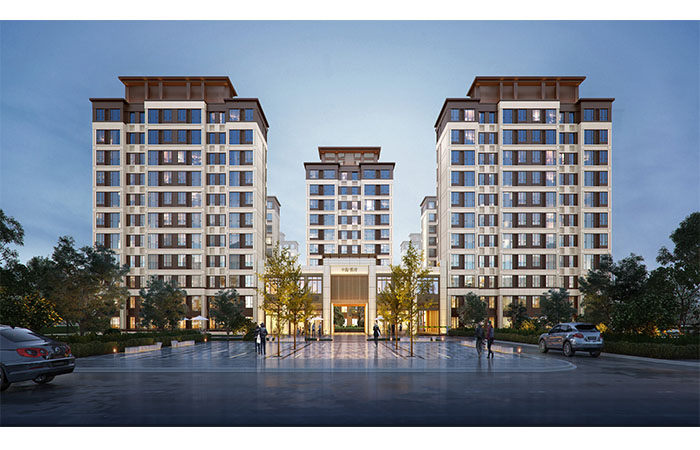 建筑立面整體風(fēng)格以“典雅”的現(xiàn)代主義氣質(zhì)為主,為了保證鮮明的層次感,采用了米黃色石材、真石漆和淺灰色金屬、金屬漆四種材質(zhì),通過選材和構(gòu)造設(shè)計,在極簡的基調(diào)中塑造動人的完整性。整體以框架結(jié)合簡潔的橫向線條的形式構(gòu)成,整體效果簡潔典雅。