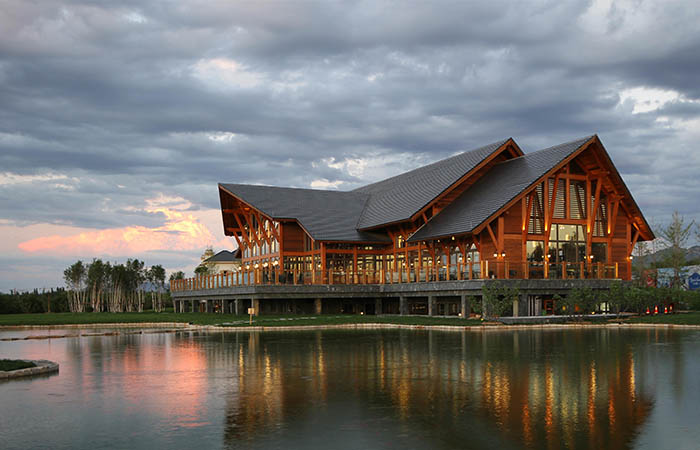 社區(qū)服務(wù)中心采用美式工匠風(fēng)格,具有異域風(fēng)情和文化韻味。松木屋采用輕木結(jié)構(gòu),外墻的墻骨柱內(nèi)側(cè)為石膏板,外側(cè)為定向刨花板(OSB板),產(chǎn)自加拿大地區(qū)的紅雪松木望板等裝飾材料,墻骨柱之間填充不燃保溫材料。適當(dāng)?shù)脑O(shè)計(jì)、材料的選擇、施工和維護(hù)將會(huì)確保木材不會(huì)由于受潮而腐爛發(fā)霉,有效的防止水汽在圍護(hù)結(jié)構(gòu)內(nèi)部凝結(jié),并能夠?qū)⒊睔馀懦觥Ec傳統(tǒng)的鋼筋混凝土、水泥等建筑材料相比,木材是一種更低碳更環(huán)保的材料,同時(shí)具備改善聲學(xué)與熱性能的特質(zhì),可以為人們提供更舒適健康的室內(nèi)環(huán)境,保證優(yōu)良的室內(nèi)空氣質(zhì)量和營造一個(gè)溫暖緩釋壓力的氛圍。