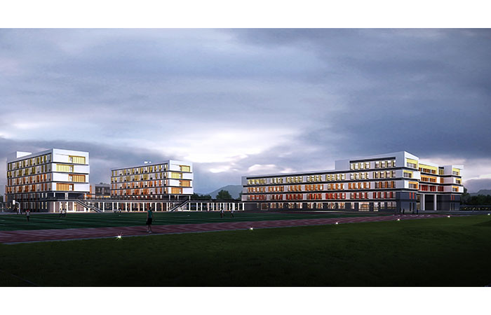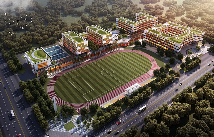 學(xué)校外立面隱喻書海,像許多本書堆疊在一起,形成書海綠洲;校園東側(cè)擁有大片綠海,便于學(xué)生親近自然,擁抱綠色,形成學(xué)習(xí)森林。中部風(fēng)雨連廊首層架空,結(jié)合中部觀景平臺提供給學(xué)生更多的共享灰空間;北側(cè)風(fēng)雨操場、學(xué)生宿舍與南側(cè)教學(xué)樓、綜合樓通過連廊成為一個(gè)建筑整體,結(jié)合西側(cè)操場和東側(cè)生態(tài)園形成立體樂園。最終創(chuàng)造一所混合性、體驗(yàn)性、人文性和生態(tài)性多功能細(xì)化互融的新型學(xué)校。