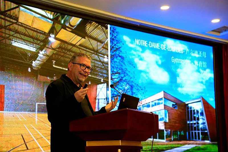 加拿大蒙特利爾Smith Vigeant建筑事務(wù)所首席建筑師Daniel Smith先生的出場(chǎng)將沙龍活動(dòng)推向高潮,Smith先生從多角度介紹了加拿大現(xiàn)代木結(jié)構(gòu)建筑,例舉了Residential Development – 住宅區(qū) 、庫(kù)朱瓦克國(guó)家公園、Gymnasium - 體育館、Theater, 劇場(chǎng)等經(jīng)典建筑作品,并且向在座的設(shè)計(jì)師展示了國(guó)外優(yōu)秀設(shè)計(jì)作品。
