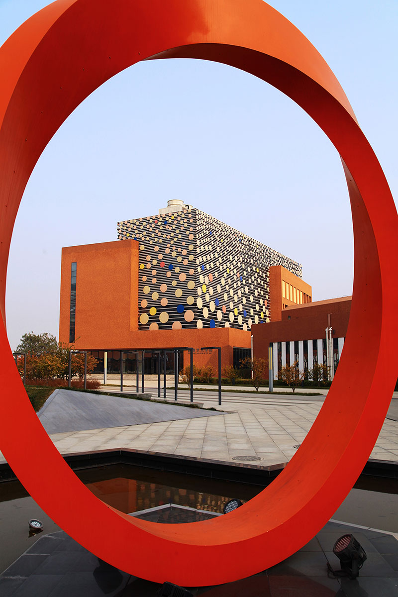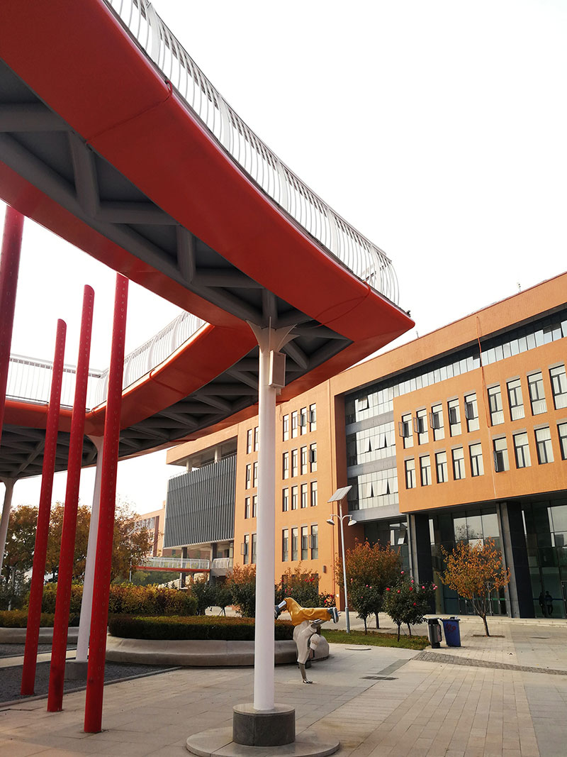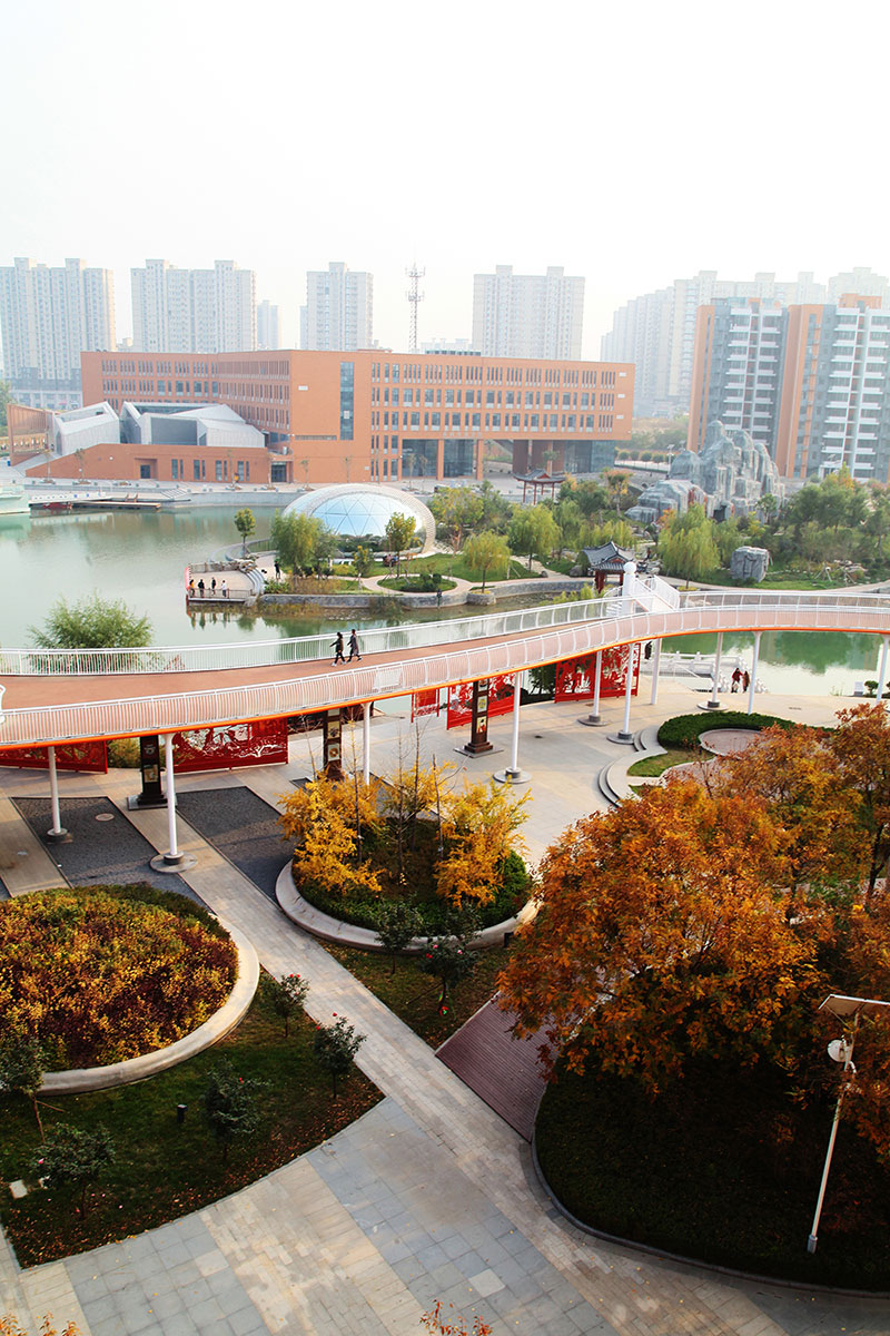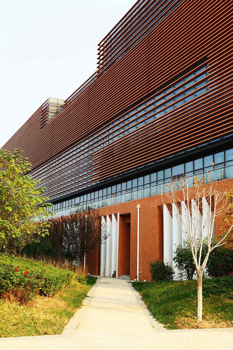 從整體規(guī)劃布局上看,校園內(nèi)各樓排布張弛有度,建筑與景觀相互結(jié)合,中央大湖與景觀廊架搭配蜿蜒蜷曲的步道,平靜中孕育詩(shī)意,給一所沉穩(wěn)的文化建筑帶來(lái)靈動(dòng)的韻律之美。