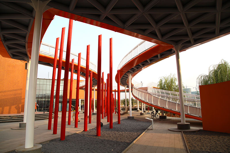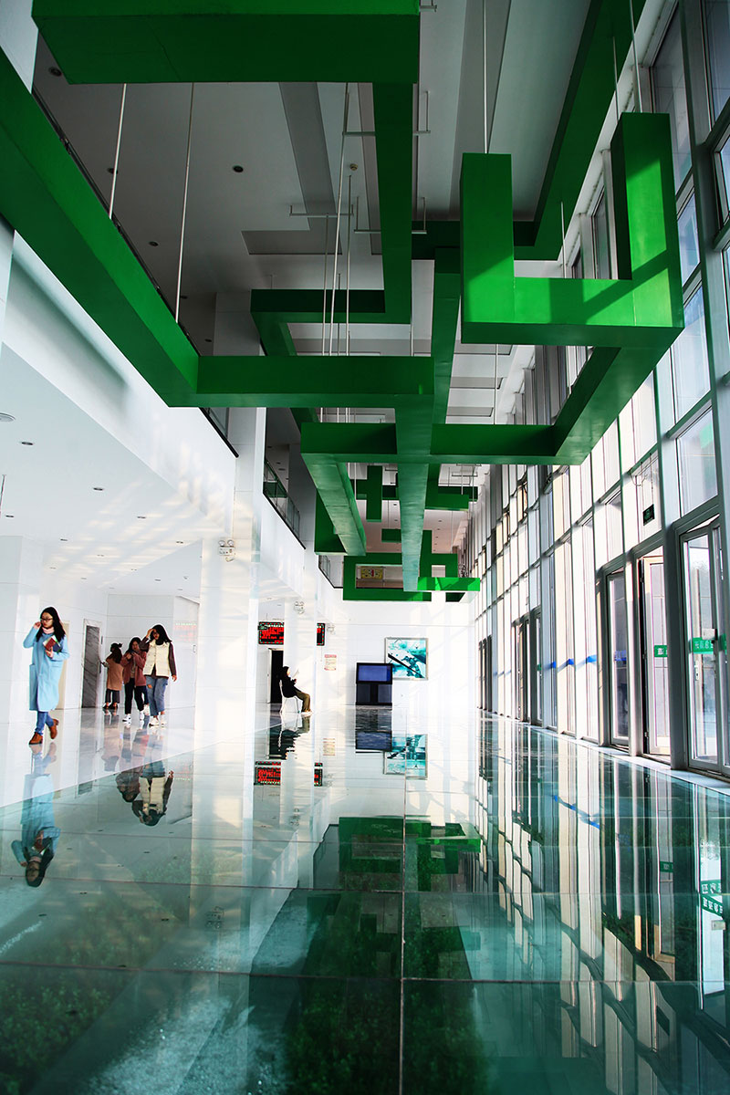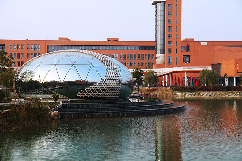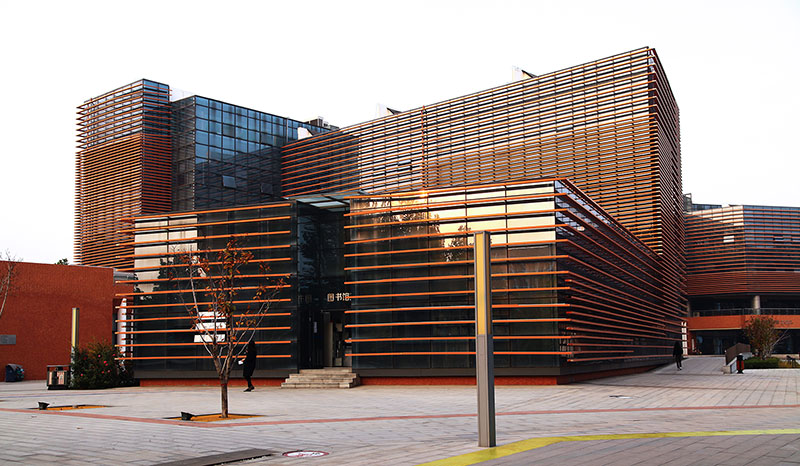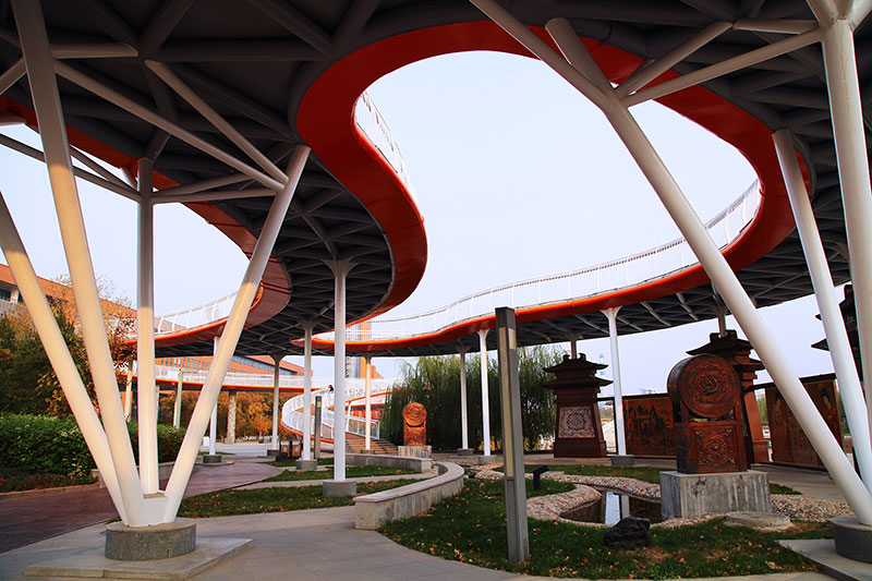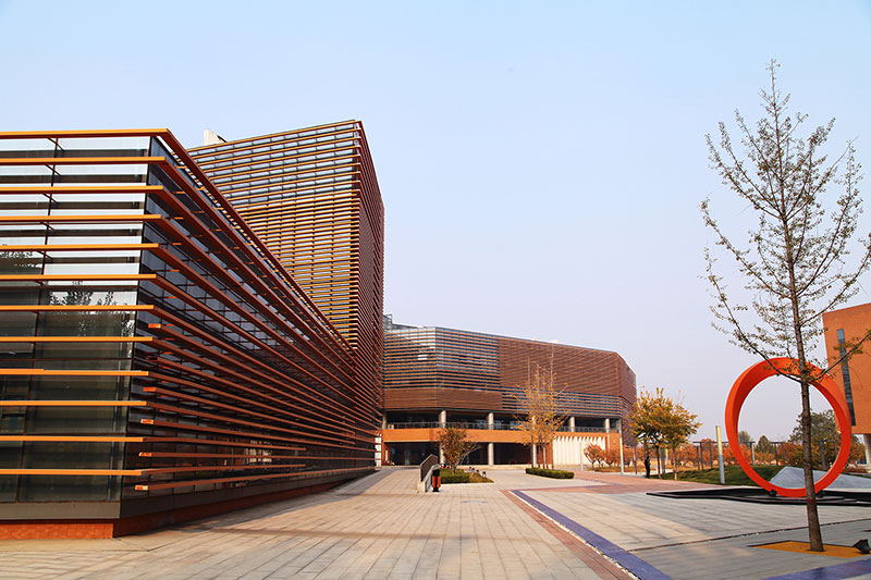 從整體規(guī)劃布局上看,校園內(nèi)各樓排布張弛有度,建筑與景觀相互結(jié)合,中央大湖與景觀廊架搭配蜿蜒蜷曲的步道,平靜中孕育詩(shī)意,給一所沉穩(wěn)的文化建筑帶來(lái)靈動(dòng)的韻律之美。