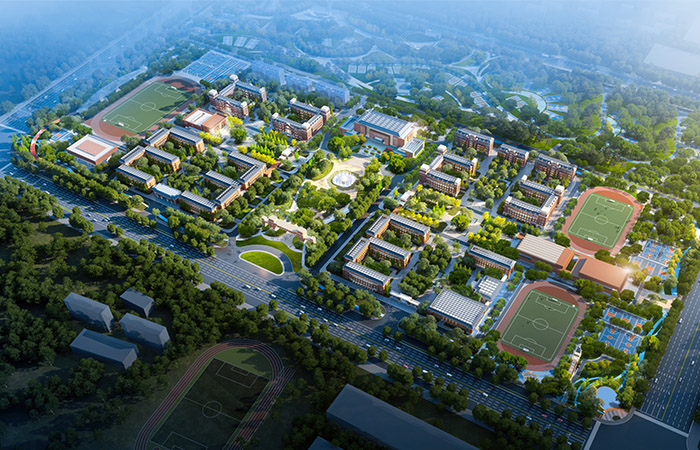 本項(xiàng)目規(guī)劃了36班小學(xué)一所、36班初中一所、60班高中一所。小學(xué)設(shè)置于場(chǎng)地西北側(cè),初中設(shè)置于場(chǎng)地西南側(cè),高中設(shè)置于場(chǎng)地東側(cè),各組團(tuán)分區(qū)明確,有機(jī)聯(lián)系。每個(gè)組團(tuán)內(nèi)教學(xué)樓、宿舍樓獨(dú)立設(shè)置,按要求配建獨(dú)立的體育館、食堂,以及圖書、行政辦公等建筑,同時(shí)采用風(fēng)雨連廊進(jìn)行串聯(lián),便于師生使用。同時(shí),為提升區(qū)域城市形象,在場(chǎng)地西北角設(shè)置一座鐘樓,北側(cè)中央位置設(shè)置一座儀式感大門。