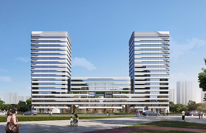 方案從平安醫(yī)院的LOGO展翅的鴿子形象中提取雙翅元素,沿建通街西立面植入兩條雙翅曲線,象征著愛與希望。南立面純凈的白色水平線條相互穿插、底層設(shè)置架空,科研樓中部設(shè)置南北通透的空中花園,同時引入垂直綠化,使整個建筑給人以平靜祥和的心理感受。