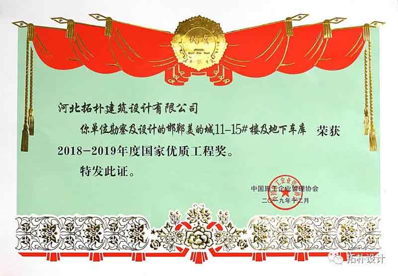 國家優(yōu)質工程獎設立于1981年,是經國務院確認的我國工程建設領域設立最早,規(guī)格最高,跨行業(yè)、跨專業(yè)的國家級榮譽獎勵。拓樸設計榮獲“國家優(yōu)質工程獎”獎項,倍感驕傲和自豪。此前,邯鄲美的城項目也曾榮獲河北省優(yōu)秀工程勘察設計獎和中國土木工程詹天佑優(yōu)秀住宅小區(qū)獎。拓樸設計初心依舊,砥礪前行!