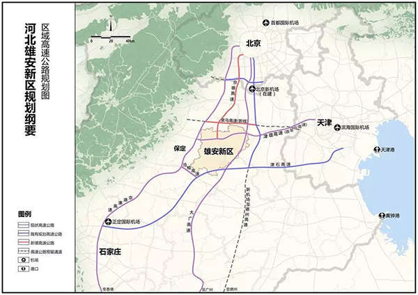 完善高速公路網(wǎng)。構(gòu)建“四縱三橫”區(qū)域高速公路網(wǎng)!八目v”為京港澳高速、大廣高速、京雄高速(含新機(jī)場北線高速支線)、新機(jī)場至德州高速,“三橫”為榮烏高速新線、津雄高速、津石高速,實(shí)現(xiàn)新區(qū)60分鐘到北京、天津,90分鐘到石家莊。加強(qiáng)新區(qū)與天津港(9.140, -0.19, -2.04%)、黃驊港交通聯(lián)系,暢通新區(qū)出海通道。