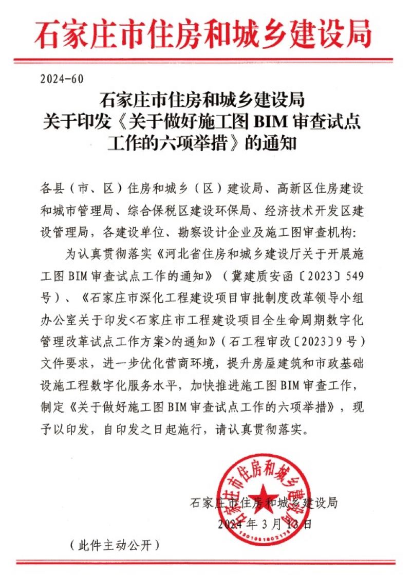 繼2023年12月7日河北省住房和城鄉(xiāng)建設(shè)廳發(fā)布《關(guān)于開展施工圖BIM審查試點工作》的通知,2024年3月13日石家莊市住房和城鄉(xiāng)建設(shè)局印發(fā)了《關(guān)于做好施工圖BIM審查十點工作的六項舉措》的通知,其中第一項舉措就提到了“自2024年4月1日起取得建筑工程規(guī)劃許可證的超高層建筑及政府投資公共建筑、城市綜合管廊、軌道交通項目須進行施工圖BIM審查,建設(shè)單位及勘察設(shè)計企業(yè)應(yīng)登錄河北省施工圖數(shù)字化聯(lián)合審查系統(tǒng)進行BIM 審查項目申報,并提交BIM 設(shè)計成果。”